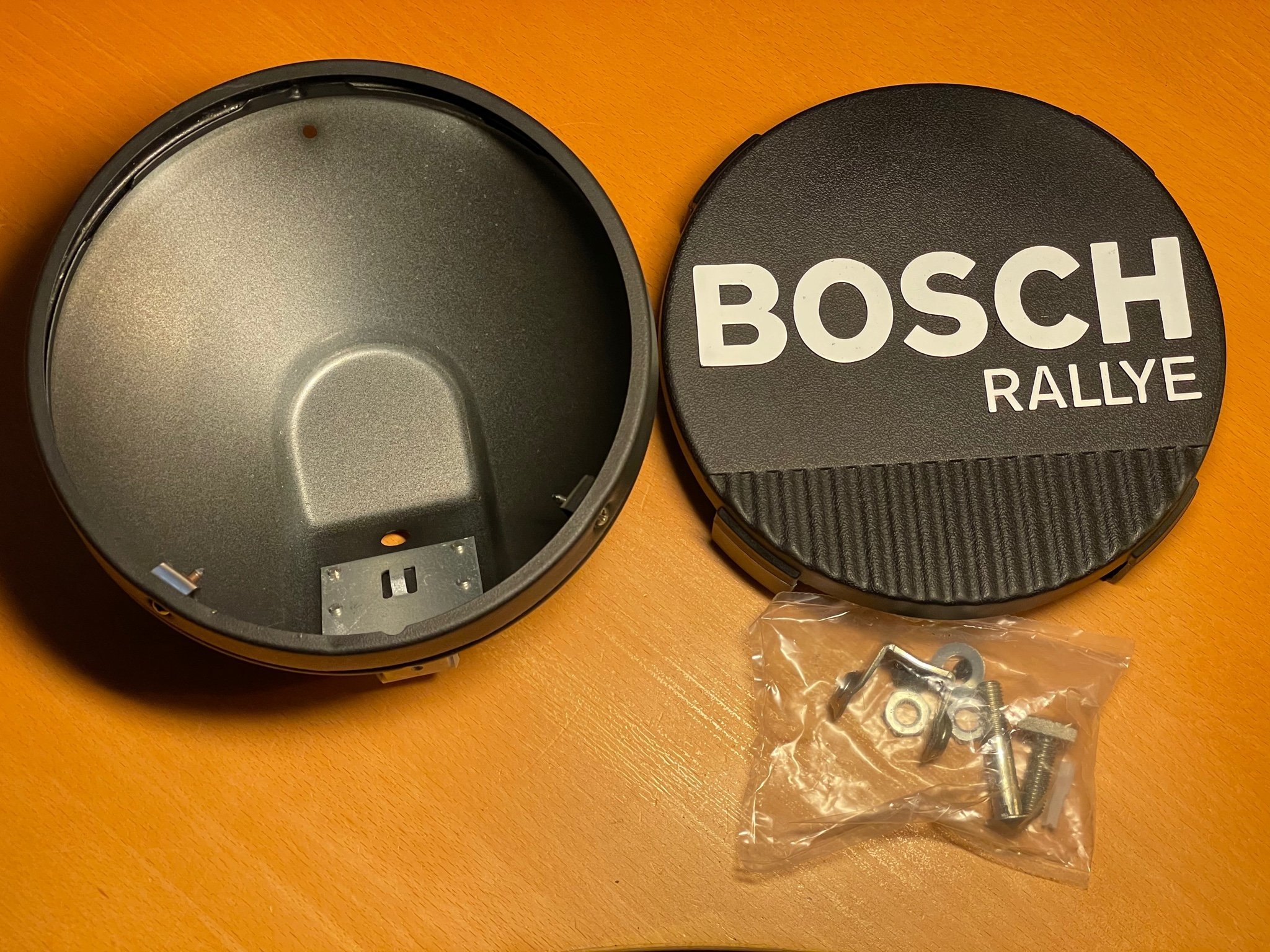 Bosch BIG KNICK Rallye 225. Fästen och manual original ligger i kartongerna. Av någon anledning har det blivit en tunn dimfilm på insidan glas på den ena lyktan,går lätt att torka bort när man ändå monterar lampa i den.