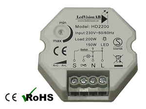 Tryckdimmer utan nolla för LED-lampor. Monteras infälld i apparatdosa bakom knapp. Gick sönder efter år kan haft otur fick ny på garantin. Annars funkat perfekt.