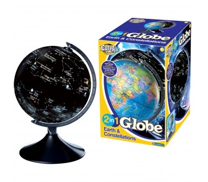 I mörker förvandlas jordgloben och låter dig studera olika stjärnbilder. Den är en vanlig jordglob på dagarna med sina kontinenter och hav och på natten växlar den automatiskt över till att bli en stjärnhimmel som lyses upp av små, små ledlampor.