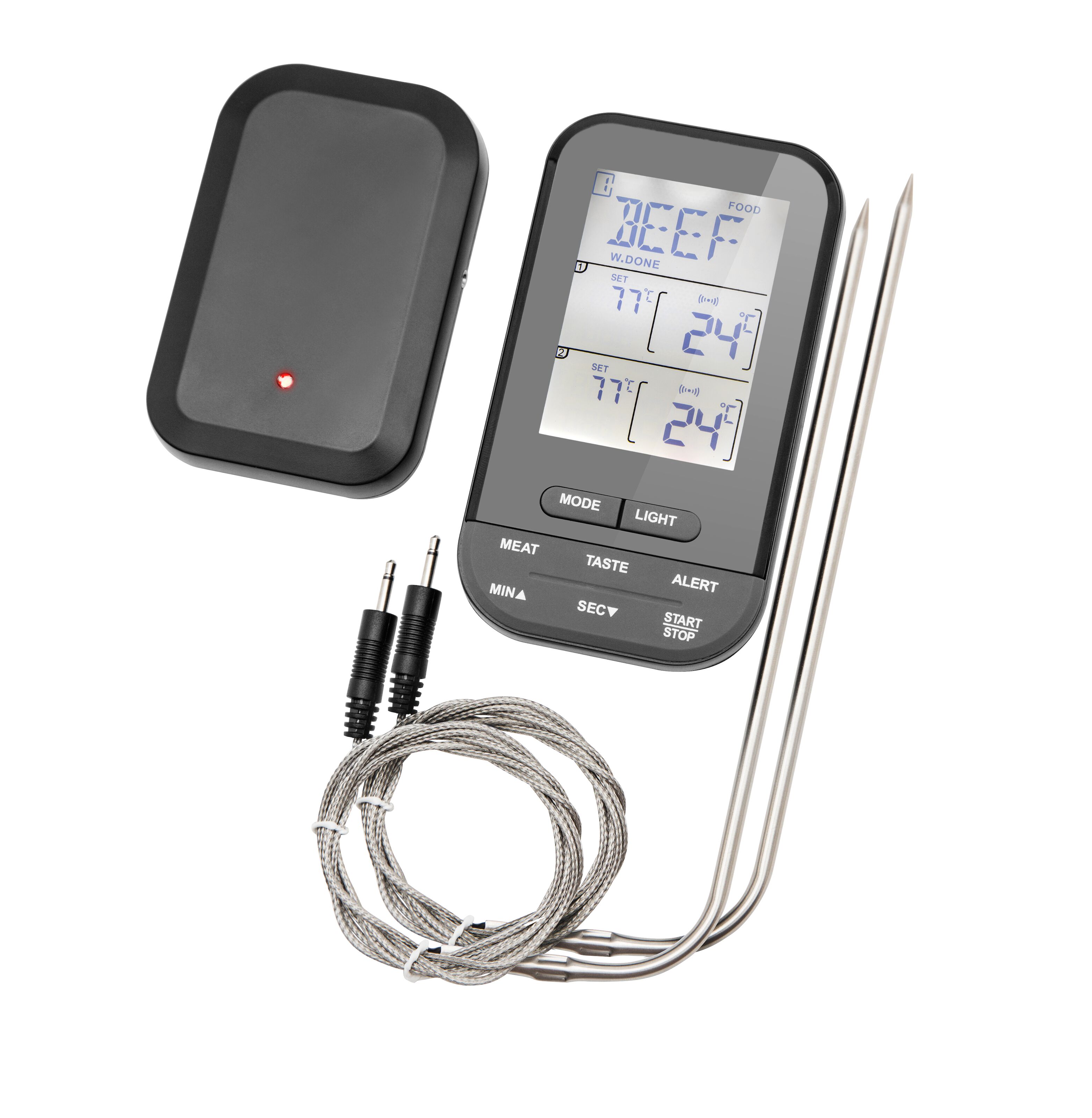 Anpassade temperaturer för åtta typer av kött och fem tillagningsgrader. Aktuell temperatur registreras med s intervall. Mätområde: till 2°C. Drivs med 4x AAA-batterier (köps separat).